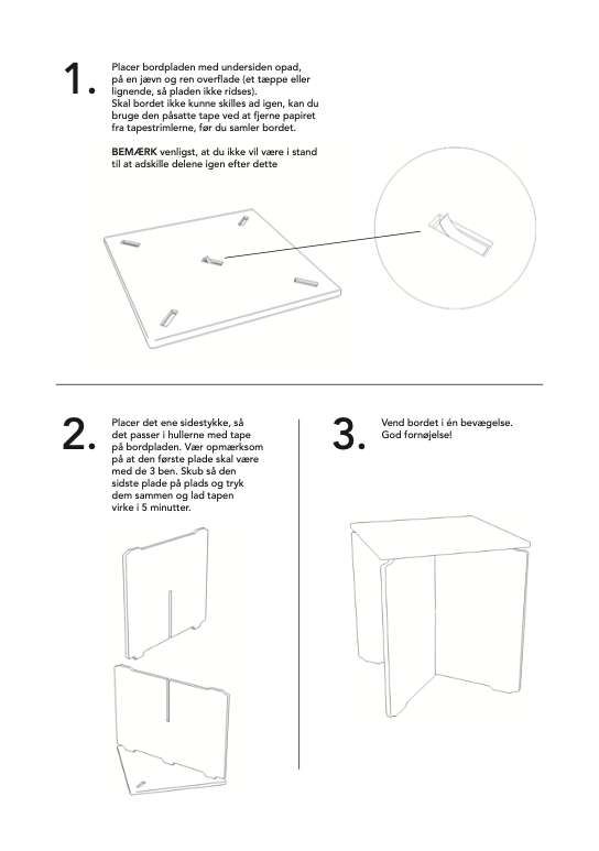 Skal bordet ikke kunne skilles ad igen, kan du bruge de strimler med dobbeltklæbende tape ved at fjerne papiret fra tapestrimlerne, før du samler bordet.
