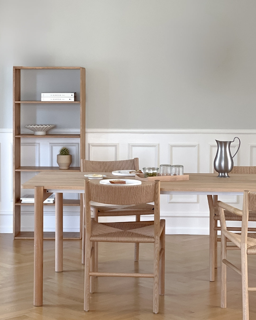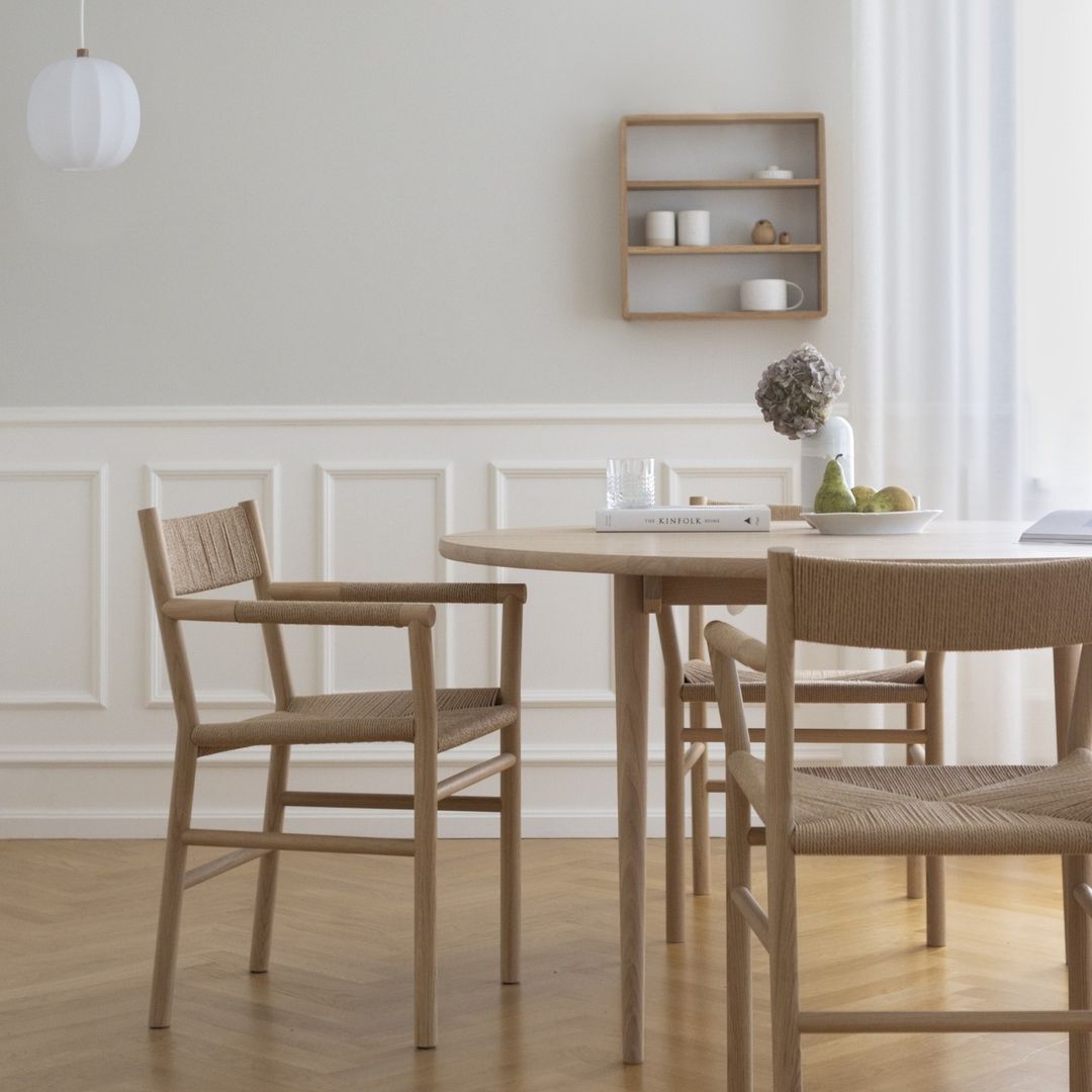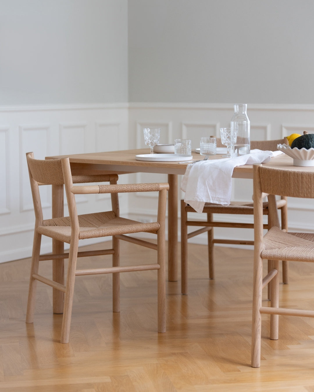 CORD er alsidig og kan vælges både med og uden armlæn, hvilket giver dig et væld af muligheder i din indretning. Den fungerer perfekt som spisebordsstol, men dens alsidighed gør den også velegnet til kontoret, entréen og soveværelset. Ved spisebordet kan du kombinere stole med og uden armlæn for at skabe et varieret udtryk. Det lyse flet og det naturlige egetræ passer ind i enhver sammenhæng.