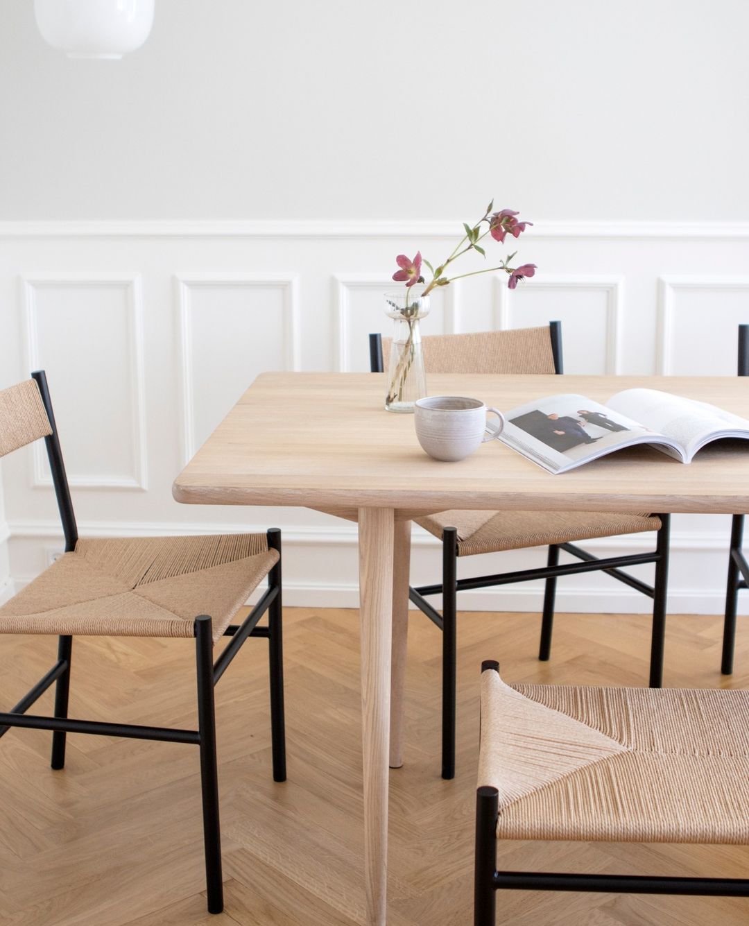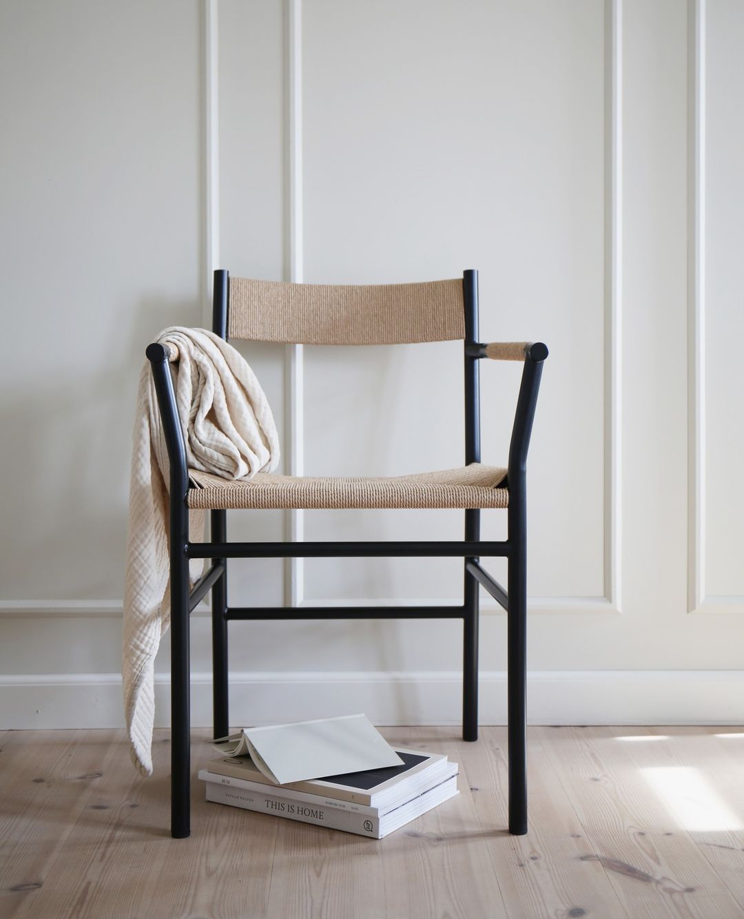 Du kan vælge stolen med og uden armlæn, hvilket giver dig mange muligheder i din indretning. CORD er den perfekte spisebordsstol, men den er også meget anvendelig på kontoret, i entréen og i soveværelset. Vælger du at bruge den ved spisebordet, kan du med fordel kombinere stole med og uden armlæn for at skabe et varieret udtryk. Det smukke lyse flet og stålstellets sorte kontrast giver dig en stol, der passer ind de fleste steder.