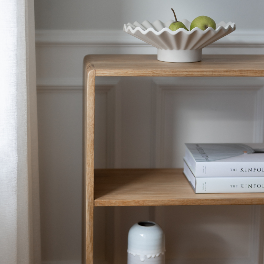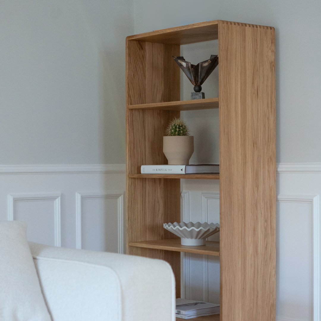 EIK reolerne er skabt med omhu og dedikation. De håndlaves af Danmarks dygtigste snedkere, der arbejder med EIK reolerne i Nordjylland. Hvert stykke egetræ udvælges omhyggeligt og sorteret for at sikre den højeste kvalitet og æstetiske finish. Fingertapsamlingerne, også kendt som notsamlinger, er en traditionel teknik inden for træarbejde, der kræver præcision og dygtighed. Disse samlinger forstærker ikke kun reolens struktur, men med deres afrundende hjørner giver de også reolerne et klassiks udtryk med et blødt twist.
