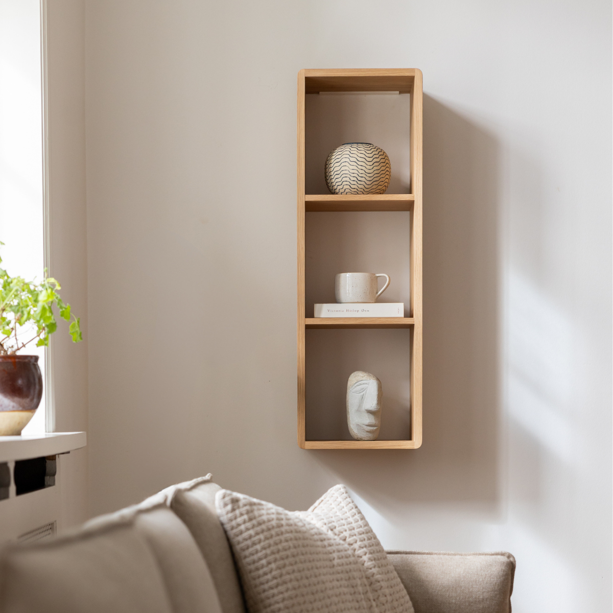 EIK reolen hænges op med et delvist skjult, hvidt beslag, der giver et rent og minimalistisk udtryk og yderligere understreger reolens elegante design. Skruer til ophæng medfølger ikke, da typen af disse afhænger af vægtypen.