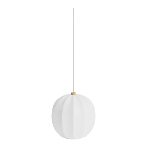 Ud over lampeseriens form, spiller samspillet mellem materialerne også en meget vigtig rolle. Det varme egetræ mod det hårde men stoflige opalglas, gør at lampen passer perfekt ind i dit nordiske hjem. Bølgerne blødgør glassets hårdhed og giver skærmen et stofligt udtryk.